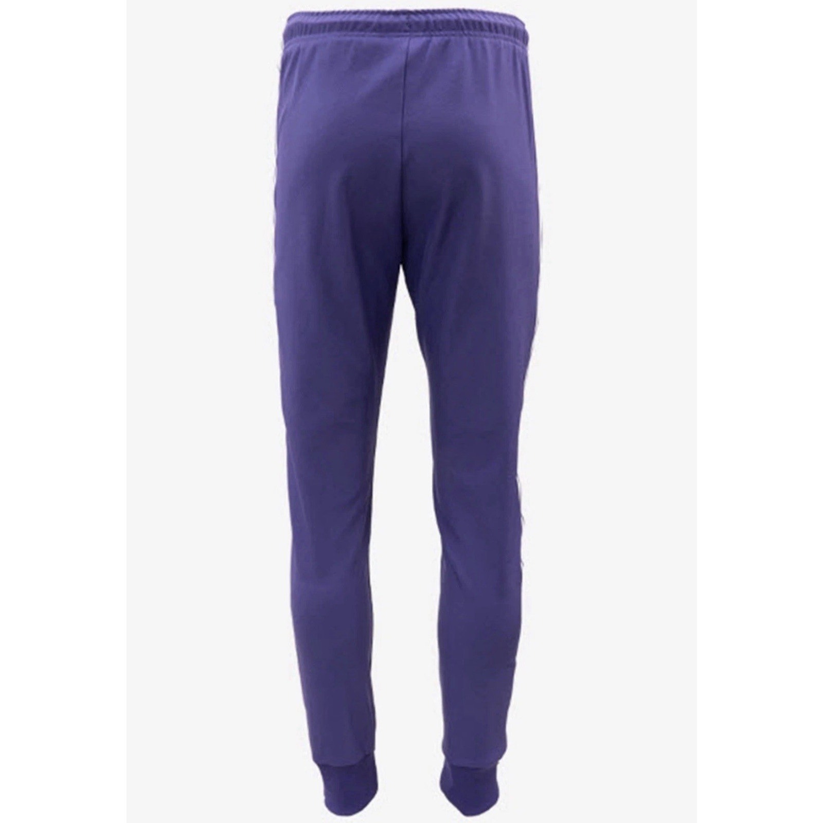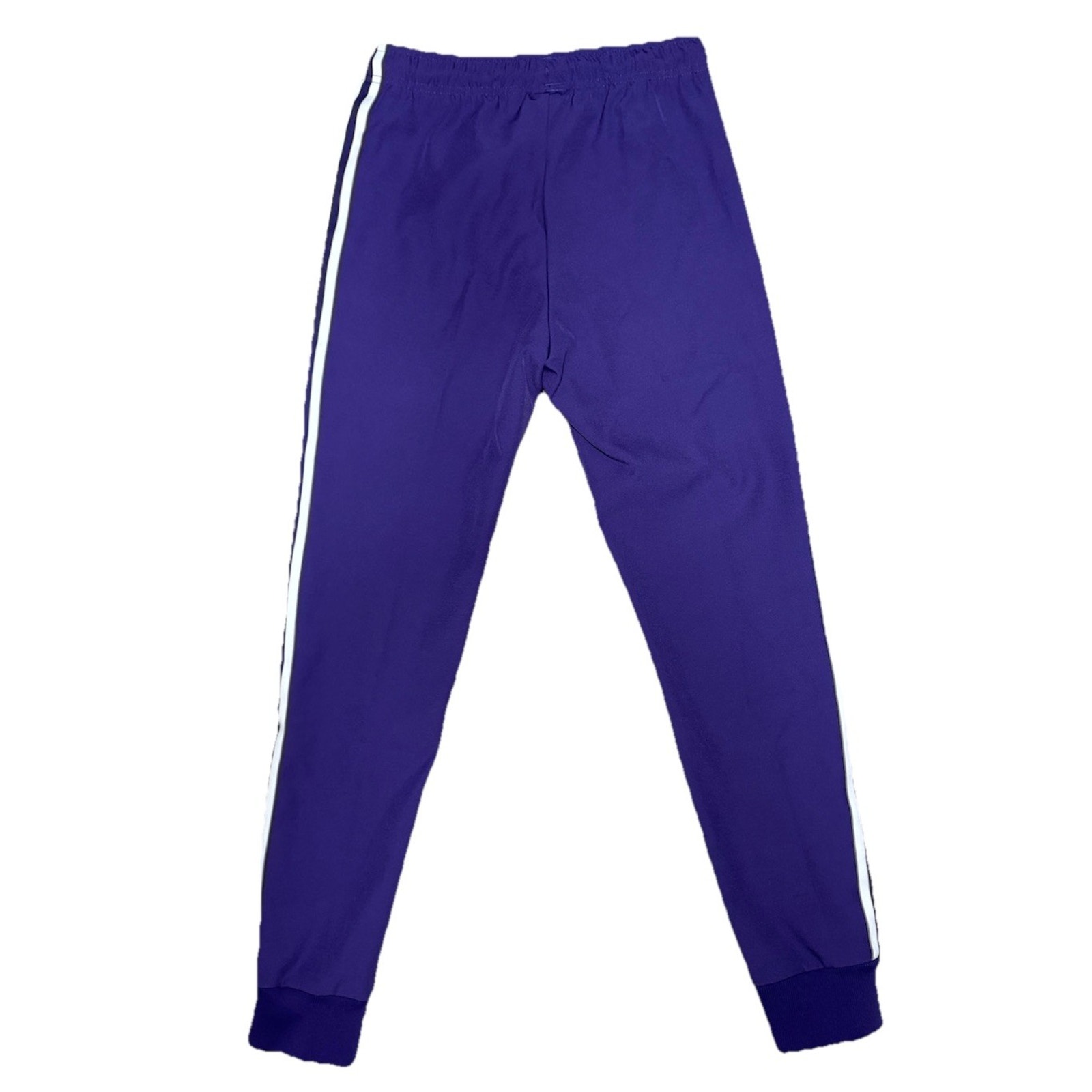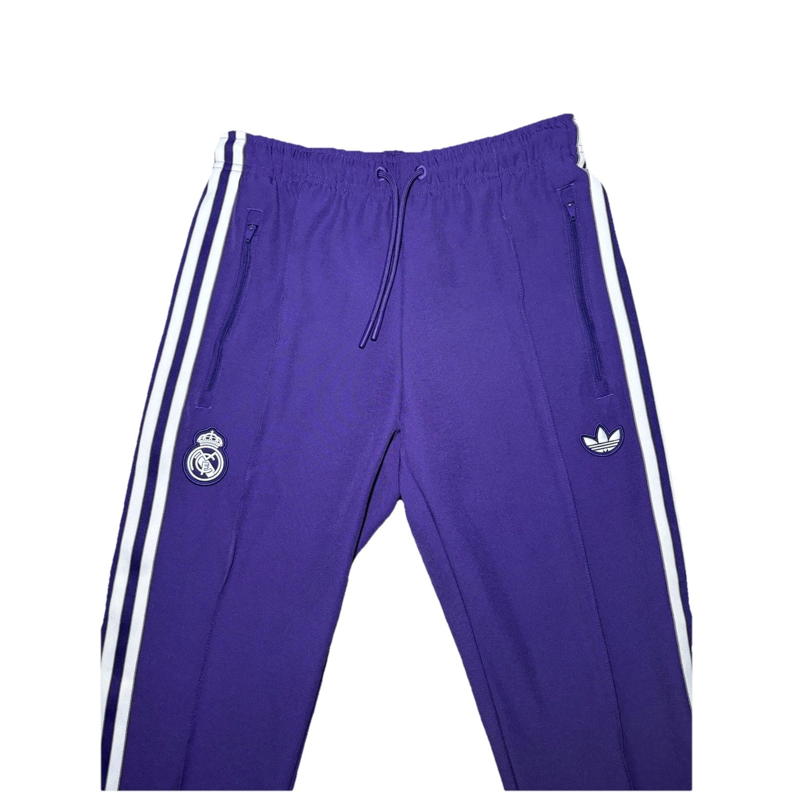 The Adidas Originals Real Madrid Terrace Icons Track Pants in men's size small are a stylish and comfortable choice for active wear. Made from polyester/spandex knit fabric, these purple pants feature a tapered and cuffed leg style with an elastic waist for a secure fit. With drawstring closure and convenient pockets, these pants are perfect for soccer and other activities. Machine washable and featuring the iconic Adidas Originals product line, these track pants offer both style and functionality for any season.
