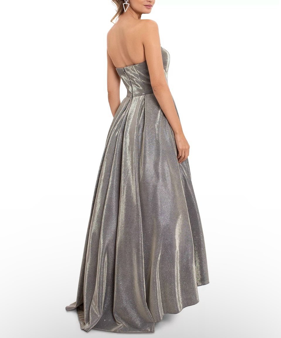 Bring on bold glamour for formal events: Betsy & Adam's metallic ball gown is stunning in gleaming metallic and finished with a high-low hem.