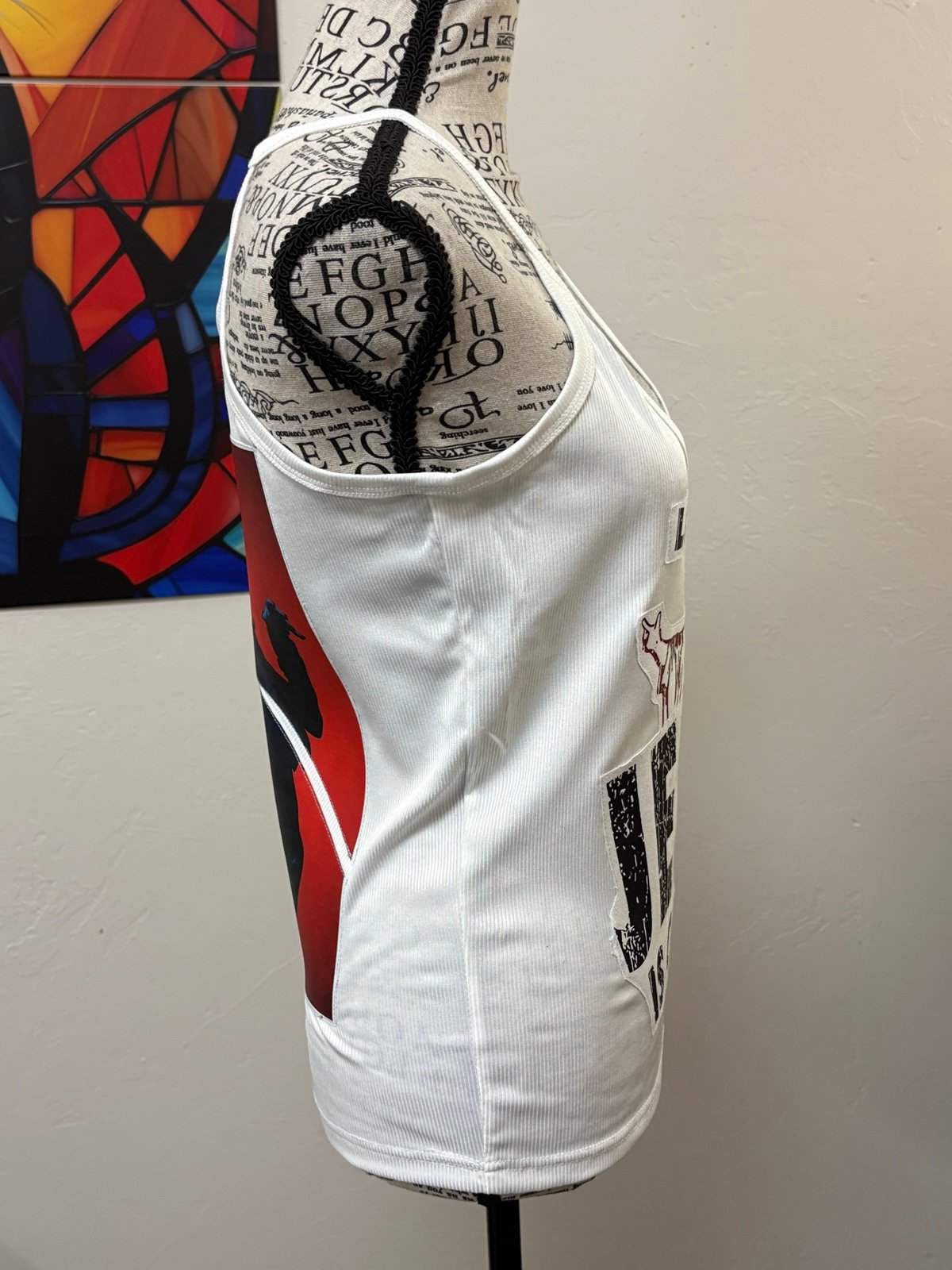 I created this super rad tank top using 4 different shirts! I cut the graphics out, handcrafted them into iron ons, rearranged them and iron pressed them on the tank and finally sewing machine stitched the graphics for quality, originality and professional finish.