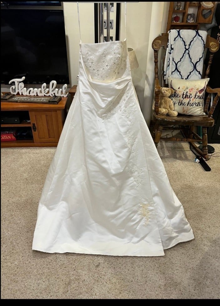 This dress is gorgeous! Would make anyone look like a princess on your special day. It’s preloved but very clean. The only signs of wear is around the bottom (see all photos). I’ve used Simple Green to remove these types of stains before and it works like magic. The last cluster of sequins on the front has yellowed a bit (not sure how that happens) but it could most likely be cleaned too. There is also some minor staining due to spray tanner on the inside but would not be noticeable when worn. The sleeveless top has tons of sparkle as does the beautiful train. The dress is fairly heavy due to the high quality materials used. size 12 in solid ivory (I would consider is a very, very light ivory). New price at least $1000.