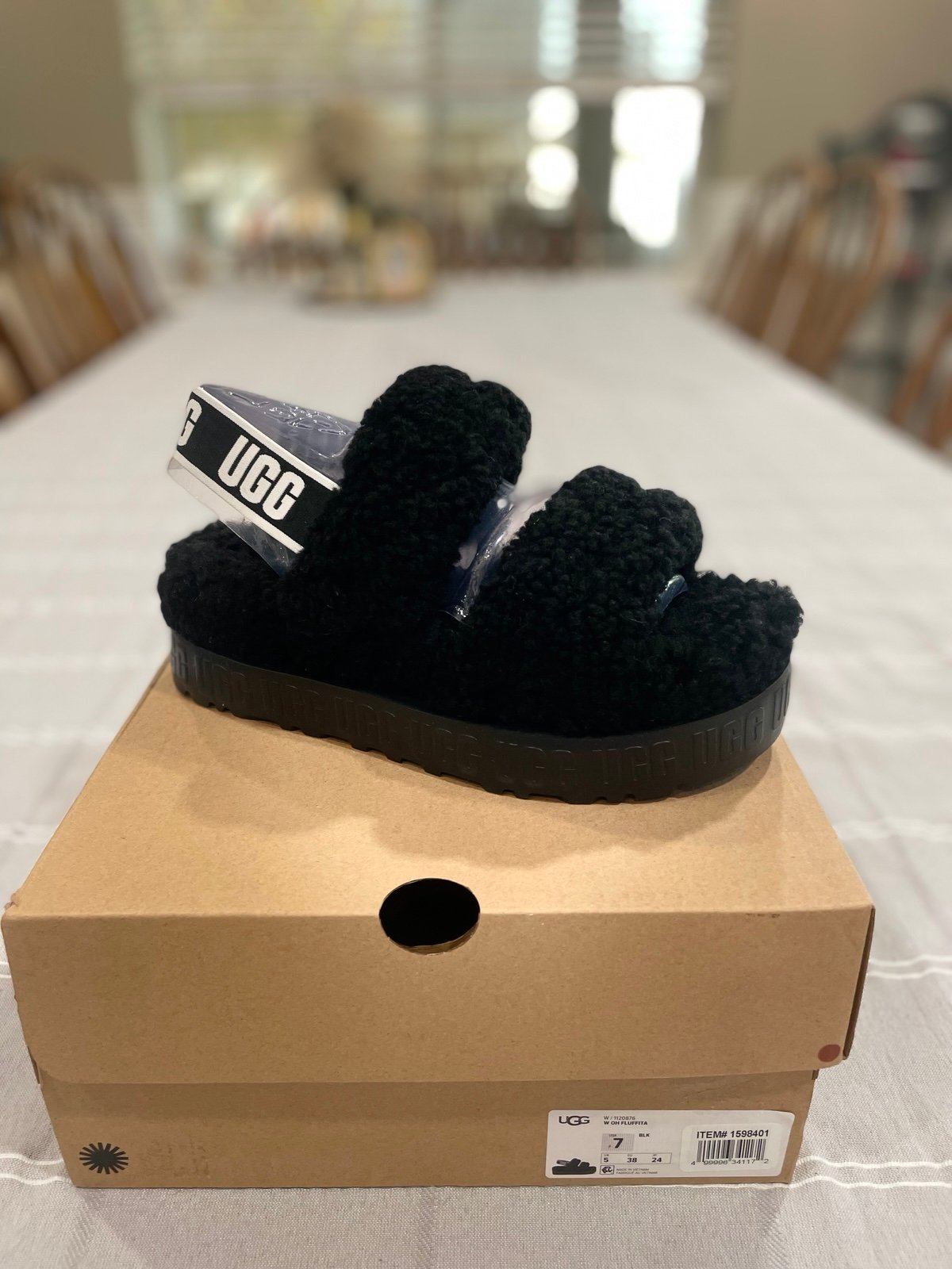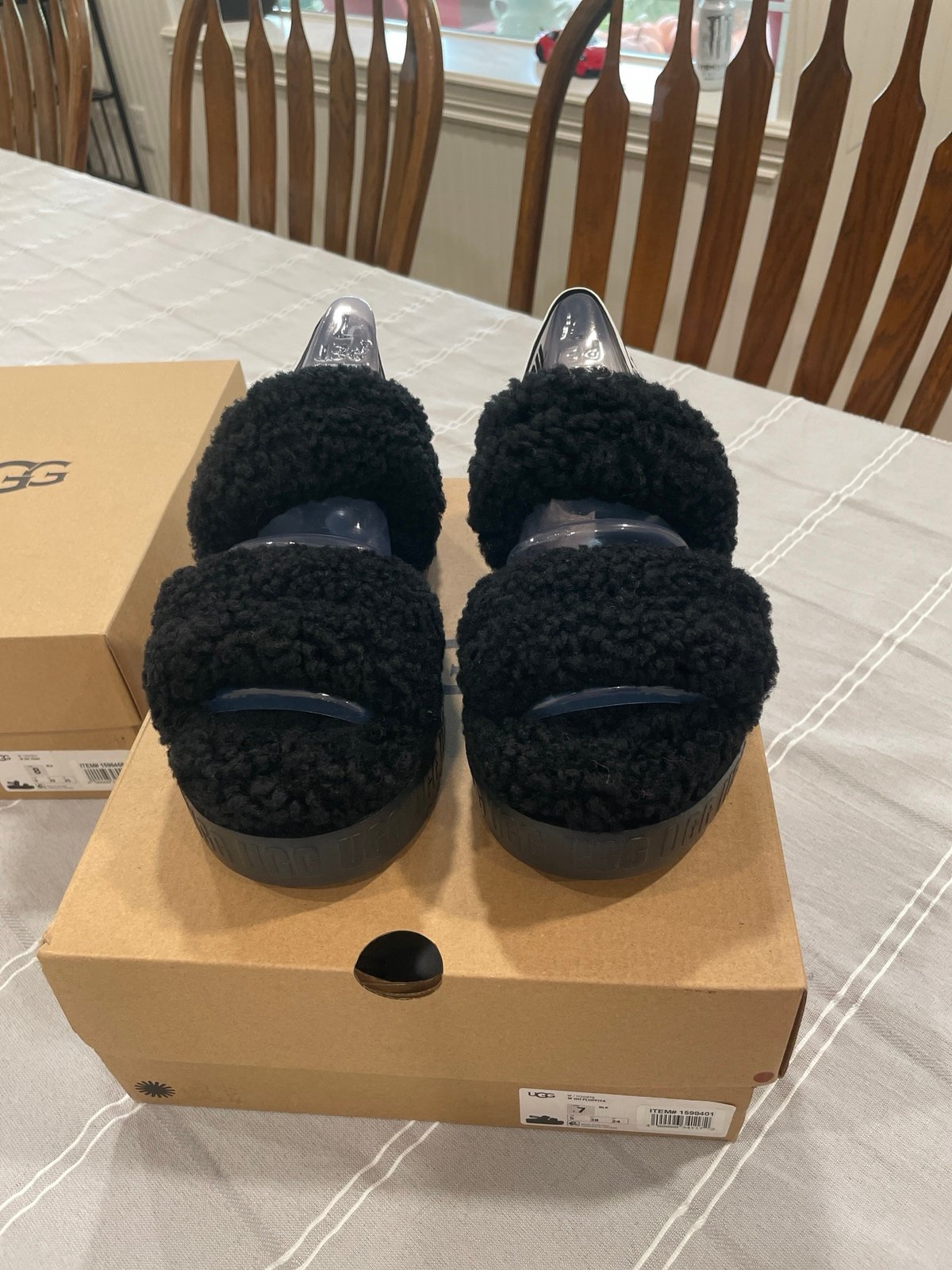 Step into comfort and style with these brand new UGG Fluffita slides in black/polyhaze, size 8. Never worn, straight from the box.