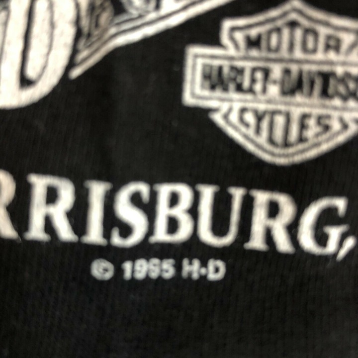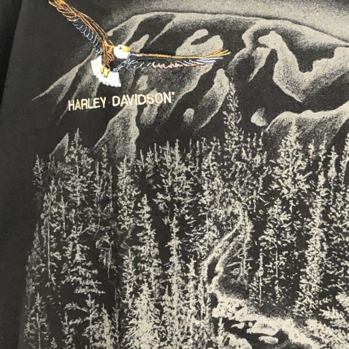 Vtg Mens 1995 Harley Davidson Motor Cycles Graphic T-shirt Front Graphic is Mountains Forrest Woods Embroidered Eagle. Sleeve has Susquehanna Valley Harley Davidson Motorcycles Harrisburg PA. Made in the USA.