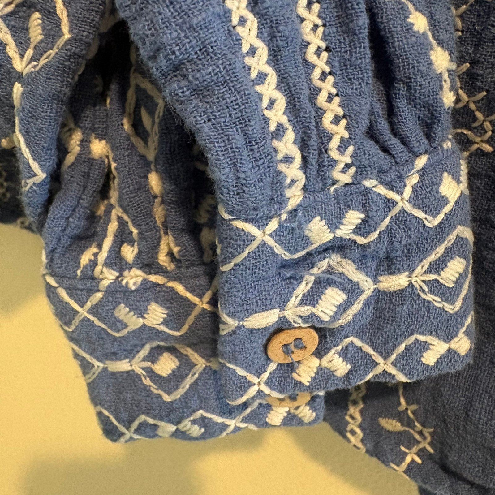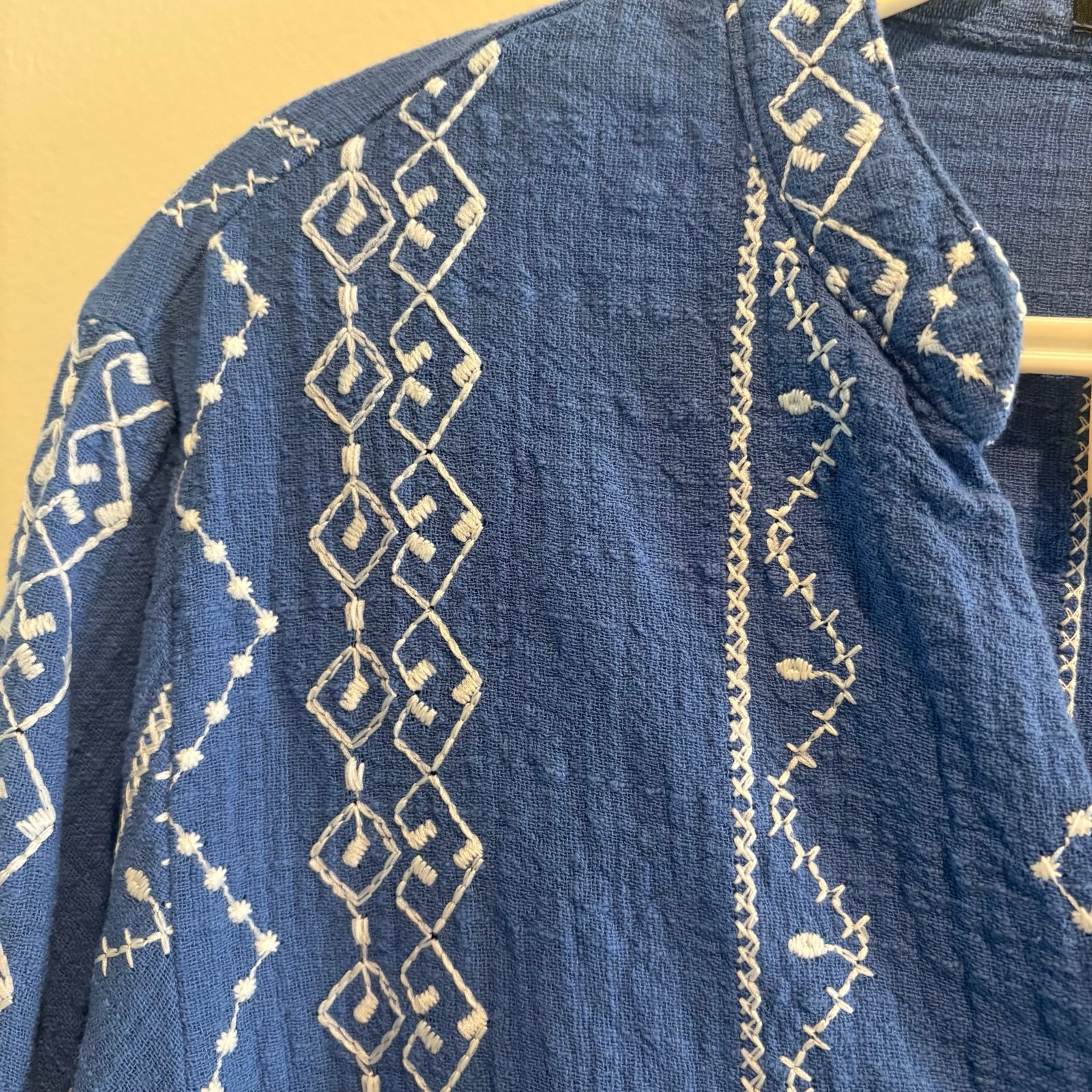 The Zara Embroidered Button down Blouse Top in blue, sz XS, is a boho/coastal/tribal-inspired piece geometric embroidered pattern